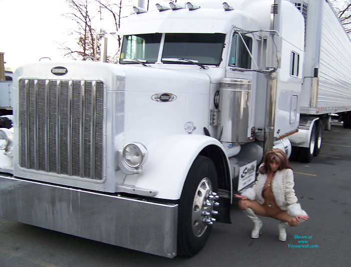 It's been quite a while since we last posted here. We were driving around last weekend looking for some good photo sites and came across this truck. Since it matched Monique's boots, we stopped and took some shots. There were some guys unloading another truck right next door. They didn't notice us until Monique was completely naked.